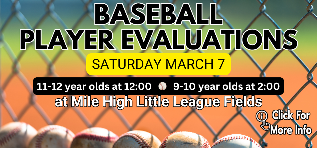 Baseball Player Evaluations for league age 9 through 12 players Saturday March 7 at Mile High Little League.
